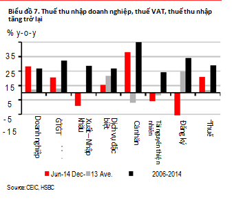 | Khối Nghiên cứu Kinh tế của Ngân hàng HSBC (HSBC Global Research) vừa công bố bản báo cáo về Kinh tế Vĩ mô - Triển vọng kinh tế vĩ mô Việt Nam số tháng 9/2014 " Ngân sách nhìn từ những phương thức tính khác nhau" . Theo đó, hiện bức tranh tài khóa Việt Nam đang được trình bày theo cách riêng và theo Quy tắc Thống Kê Tài Chính Quốc Gia năm 2001- GFSM 2001 – Việt Nam, IMF cũng cách tính riêng cho trường hợp của Việt Nam dựa trên quy tắc GFSM 2001. Với những cách trình bày khác nhau thâm hụt ngân sách ở Việt Nam cho kết quả khác nhau. HSBC cho rằng, bức tranh tài khóa thực tế có thể đang cải thiện nhưng vẫn có nhiều quan ngại. Bởi những khoản thu chi chuyển nguồn phát sinh lớn – thu chuyển nguồn năm 2012 lên đến 9%GDP; các khoản chi đầu tư nguồn trái phiếu chính phủ, cho vay lại, doanh nghiệp nhà nước.... không được ghi nhận đầy đủ trong báo cáo quyết toán NSNN dẫn đến IMF cũng như nhiều tổ chức nghiên cứu trên thế giới phải ước tính. Các vấn đề trên theo HSBC tiếp tục che phủ bức tranh tài khóa thực sự của Việt Nam. Điều này không có nghĩa là vị thế về tài khóa của Việt Nam lành mạnh hơn hay tệ hơn những gì chính phủ công bố. HSBC cho biết, mục tiêu của họ là tìm cách giải thích tại sao lại có các cách tính khác nhau về cân bằng tài chính (cân đối ngân sách - fiscal balance, P.v), phương thức diễn giải ngân sách và các phân tích khác nhau về số liệu và cuối cùng, những yếu tố nào, dựa trên các thông tin có sẵn, đáng dùng để xem xét sức khỏe tài khóa của Việt Nam. Biểu đồ 4 cho thấy thuế nhập khẩu, nguồn thu các công ty quốc doanh và dầu khí đóng góp nhiều nhất cho tổng thu ngân sách trong năm 2012. Từ năm 2000, nguồn thu từ dầu đóng góp 22% tổng thu và trong năm 2012, con số này là 19%. Điều này có nghĩa là giá dầu có ý nghĩa không chỉ về giá trị thương mại đối với Việt Nam mà cả về thu ngân sách và sức khỏe tài chính. Biểu đồ 4 cũng cho thấy ngân sách có xu hướng chưa đánh giá đúng nguồn thu từ dầu, khi các giả định về giá theo thùng thường rất thận trọng. Thuế và phí là một nguồn thu lớn nữa. Trong các loại thuế và phí, thuế thu nhập doanh nghiệp, VAT và thuế nhập khẩu là những khoản đóng góp quan trọng nhất. Trong các doanh nghiệp đóng thuế, các doanh nghiệp quốc doanh đóng góp phần lớn nhất; tuy nhiên, do tốc độ tăng trưởng chậm chạp, tác động của nguồn thu này có khả năng giảm dần theo thời gian. Lưu ý rằng việc lĩnh vực sản xuất phục hồi đã góp phần làm tăng doanh thu từ thuế thu nhập doanh nghiệp trong tháng 6 năm 2014, VAT (nhập khẩu) và thuế thu nhập cá nhân so với thời điểm cuối 2013. ![]() Biểu đồ 7 cho thấy thu ngân sách từ thuế tăng 14% so với cuối năm trước so với mức 2% trong năm 2013. ![]() Biểu đồ 8 mô tả chi tiết các chi phí hiện thời và đầu tư trong tương quan với GDP. Chi phí trung bình (không bao gồm trả nợ gốc) chiếm khoảng 30% GDP kể từ năm 2006. Kể từ đó, con số này đã giảm xuống 28% của GDP. Phần lớn khoản giảm đến từ phát triển đầu tư, giảm trung bình 7% xuống mức 5% GDP hiện tại. Các chi phí hiện tại đều ở tiệm cận mức trung bình 22% trước đây. Chi phí trả lãi tăng nhẹ chiếm 1,8% GDP trong quý 2 năm 2014 từ mức trung bình 1,4% trước đây. Nhìn chung, HSBC kỳ vọng chi phí hiện tại sẽ giữa nguyên. Với nguồn thu được cải thiện và chi phí có thể không thay đổi, mức thâm hụt ngân sách sẽ có thể được cải thiện tốt hơn. T. Sam Theo Infonet |